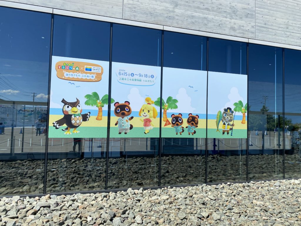 日本海すぐ脇に立つ、水族館、入口からあつ森キャラが大量お出迎えです。かわよ!